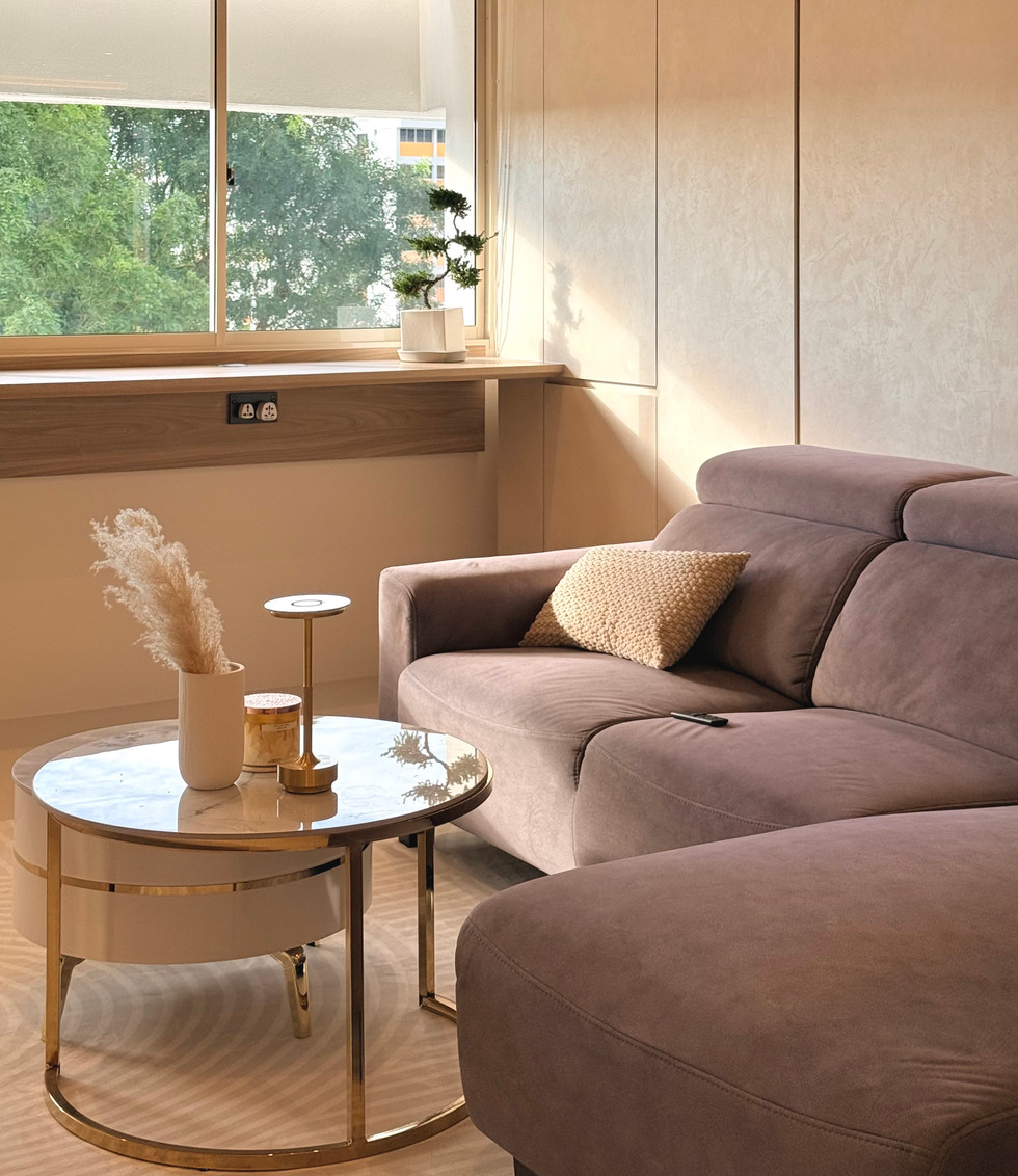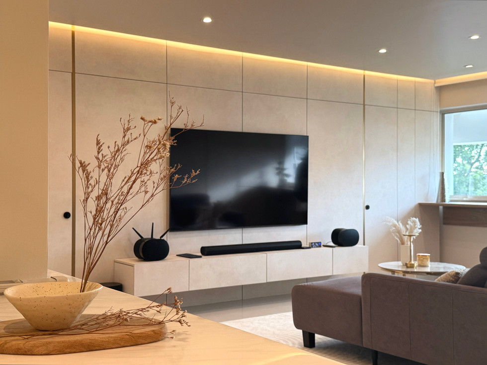 This living space embodies a sophisticated Modern Luxury concept, utilizing a seamless floor-to-ceiling feature wall with gold metallic accents to create a sense of expansive height and elegance. The warm cove lighting and minimalist stone-textured surfaces harmonize to produce a serene, hotel-inspired atmosphere that is both cozy and refined. By integrating sleek, handle-less carpentry with organic decor elements, the design achieves a perfect balance between functional high-end living and timeless aesthetic comfort.